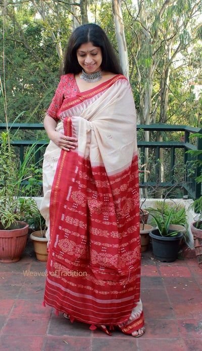 The subtle beige base is perfectly complemented by rich red ikat motifs and borders, giving it a classic yet elegant look. Ideal for daily wear, office wear, casual outings, and cultural events, this saree is designed for women who prefer simplicity with tradition.