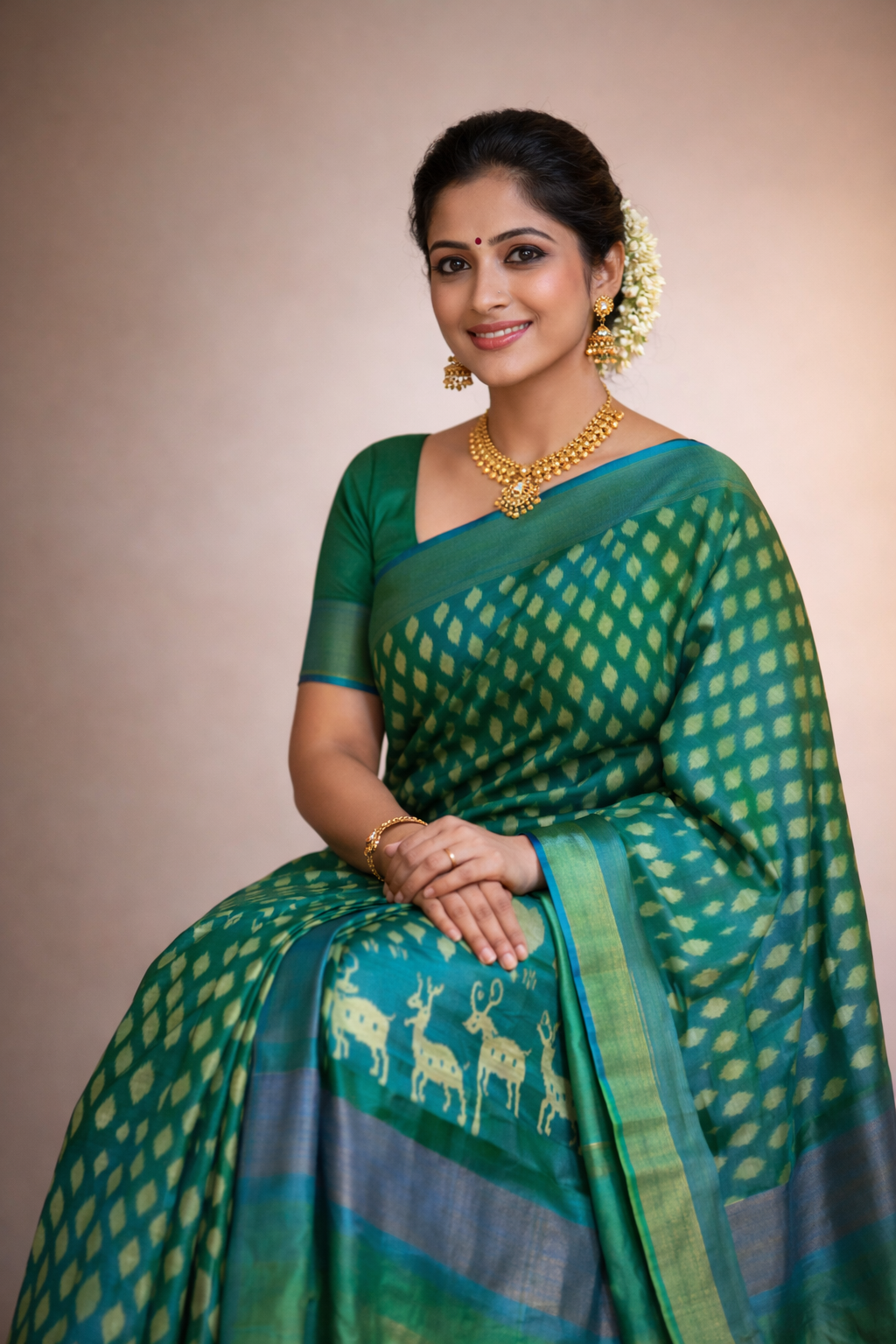 POCHAMPALLY IKAT PATTU SILK GREEN SAREE WITH TRADITIONAL DEER MOTIFS AND CONTRAST BORDER BLOUSE SAME AS IKAT DESIGN